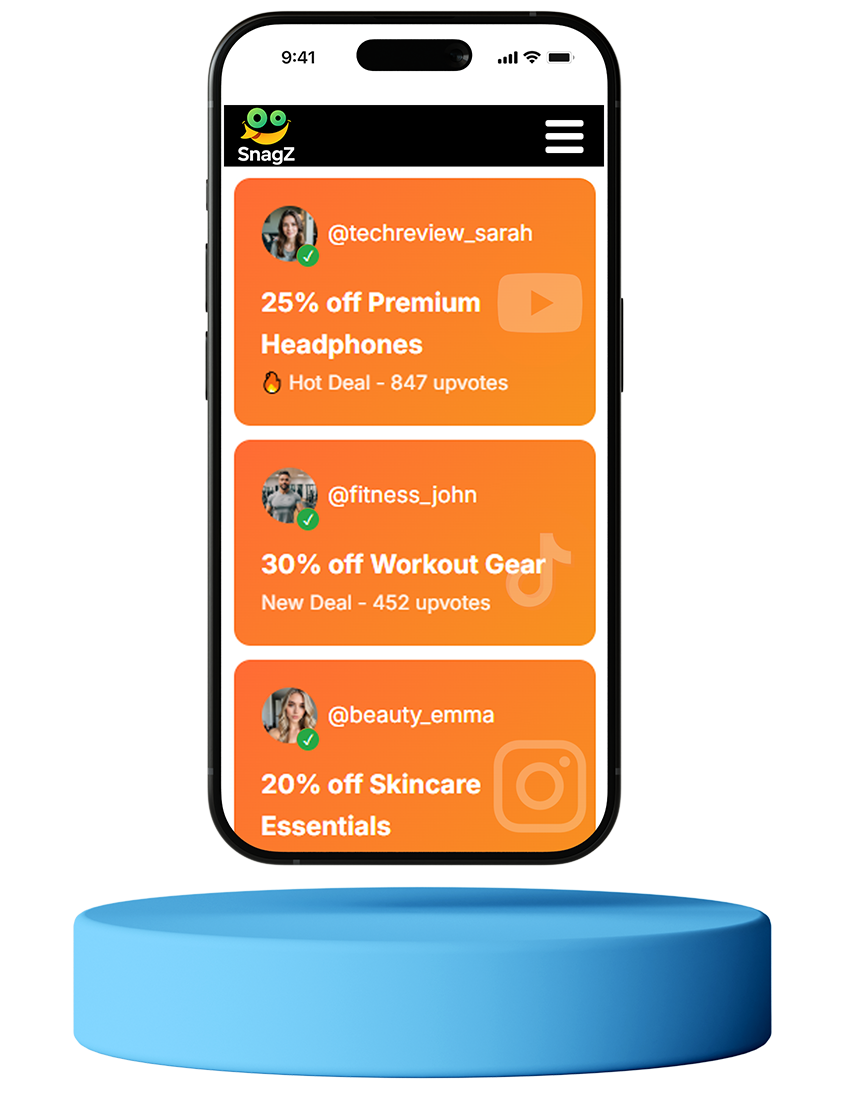 SnagZ is the only platform where you'll find discount codes that work and verified influencer deals from creators who actually use the products they recommend. No more guessing if a promo code is valid - every deal is community-validated before it reaches you.